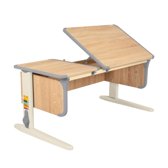 Учитывая предыдущий опыт, компания решила предложить будущим владельцам разделённую двойную столешницу, где одна часть способна регулироваться по углу наклона, а вторая всегда остаётся в статическом положении. Это позволило решить целый ряд проблем в процессе эксплуатации и избавить пользователей от необходимости докупать боковые приставки для расширения полезного пространства. Теперь часть стола всегда будет под перпендикулярным углом относительно пола и вместит на себе все необходимые для учёбы предметы без потребности подпирать их чем-то.В то же время, ребёнок сможет с комфортом писать, рисовать, чертить и производить любые другие действия, установив рабочий инструмент под правильным наклоном, как рекомендуют специалисты. А когда занятия будут окончены, подвижная часть стола с лёгкостью вернётся в исходное положение.
